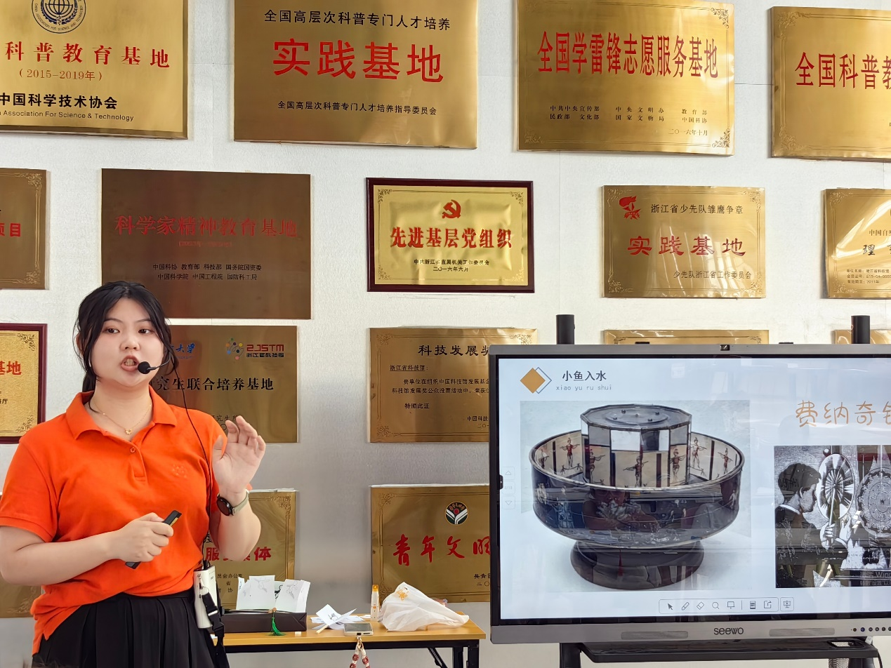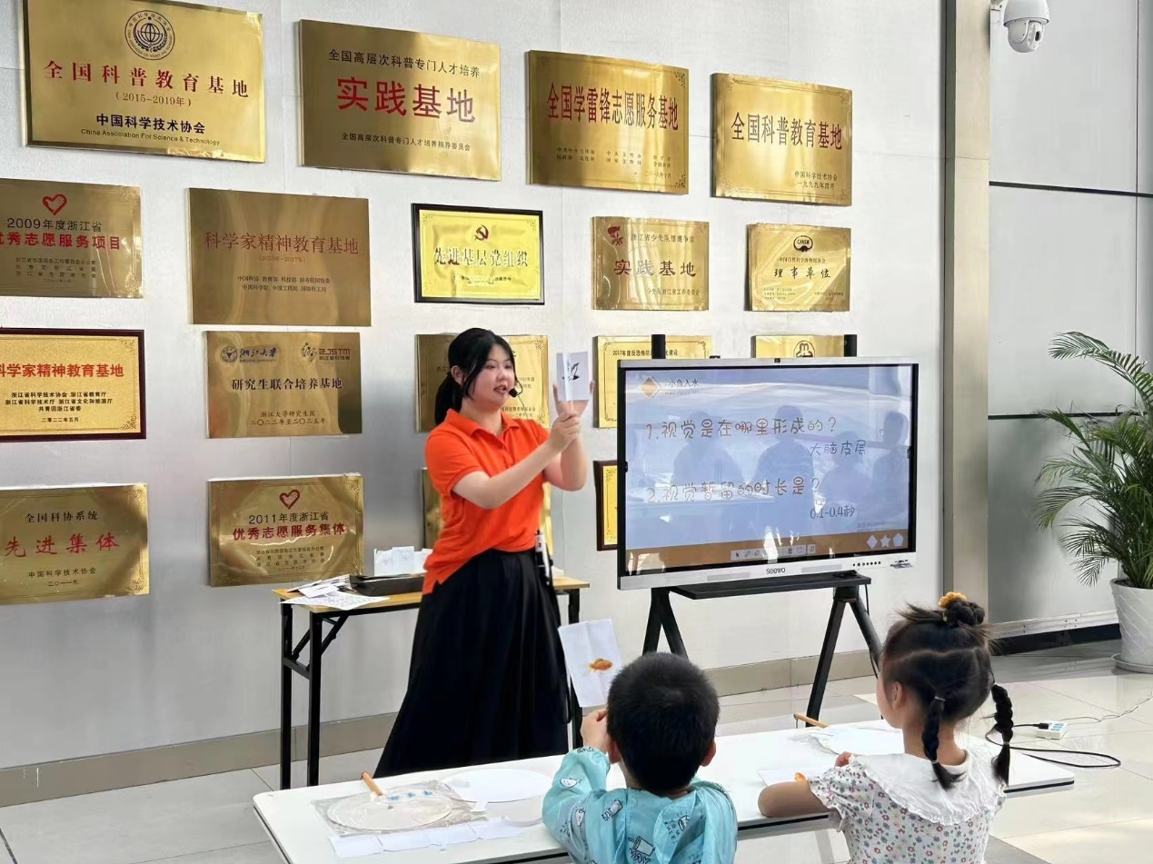 活动一开始,科普辅导员通过“水中鱼”的小实验和相关视频讲述了“视觉暂留”的原理。视觉暂留现象是光对视网膜所产生的视觉在光停止作用后,仍保留一段时间的现象。简单地说,就是光线已经消失了,但是人在短时间内还能感受到视觉的残留。紧接着,辅导员邀请了一位小朋友上台互动,进一步引出“视觉暂留现象的时长在0.1-0.4秒之间”这个知识点。小朋友们被有趣的实验和“冷”知识吸引,求知欲瞬间“热”了起来。