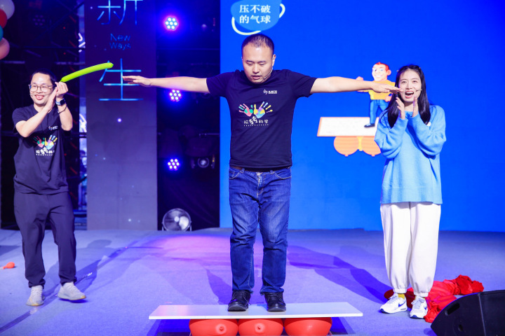 紧接着就是小朋友们最喜欢的科学实验秀了,由浙江省科技馆带来。小朋友们纷纷跑到前排:“好期待啊。”6个红气球放在舞台上,上面还压了一块木板,“他们要干什么?”因为有这块板,一个大男人站上去,气球都不会破。