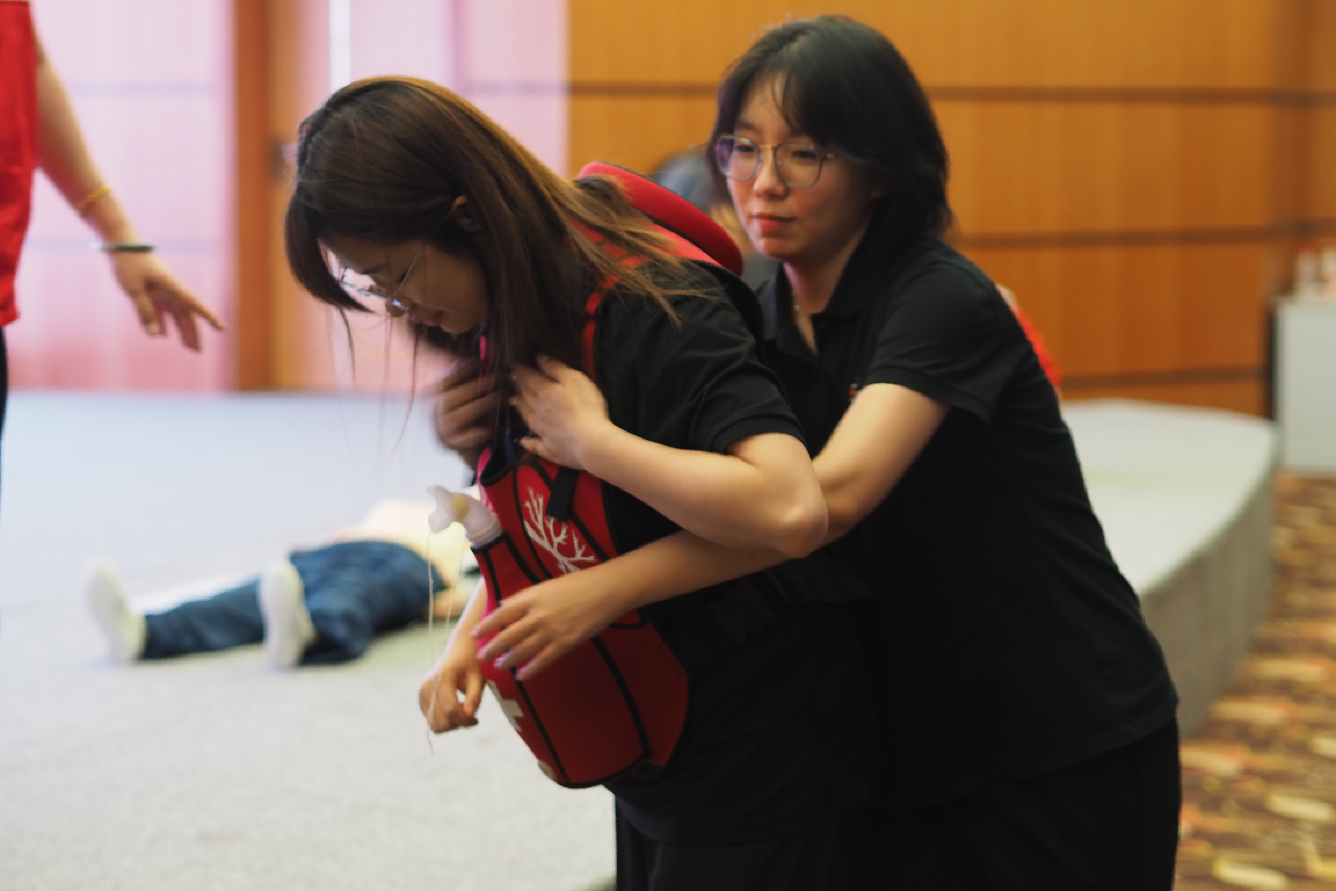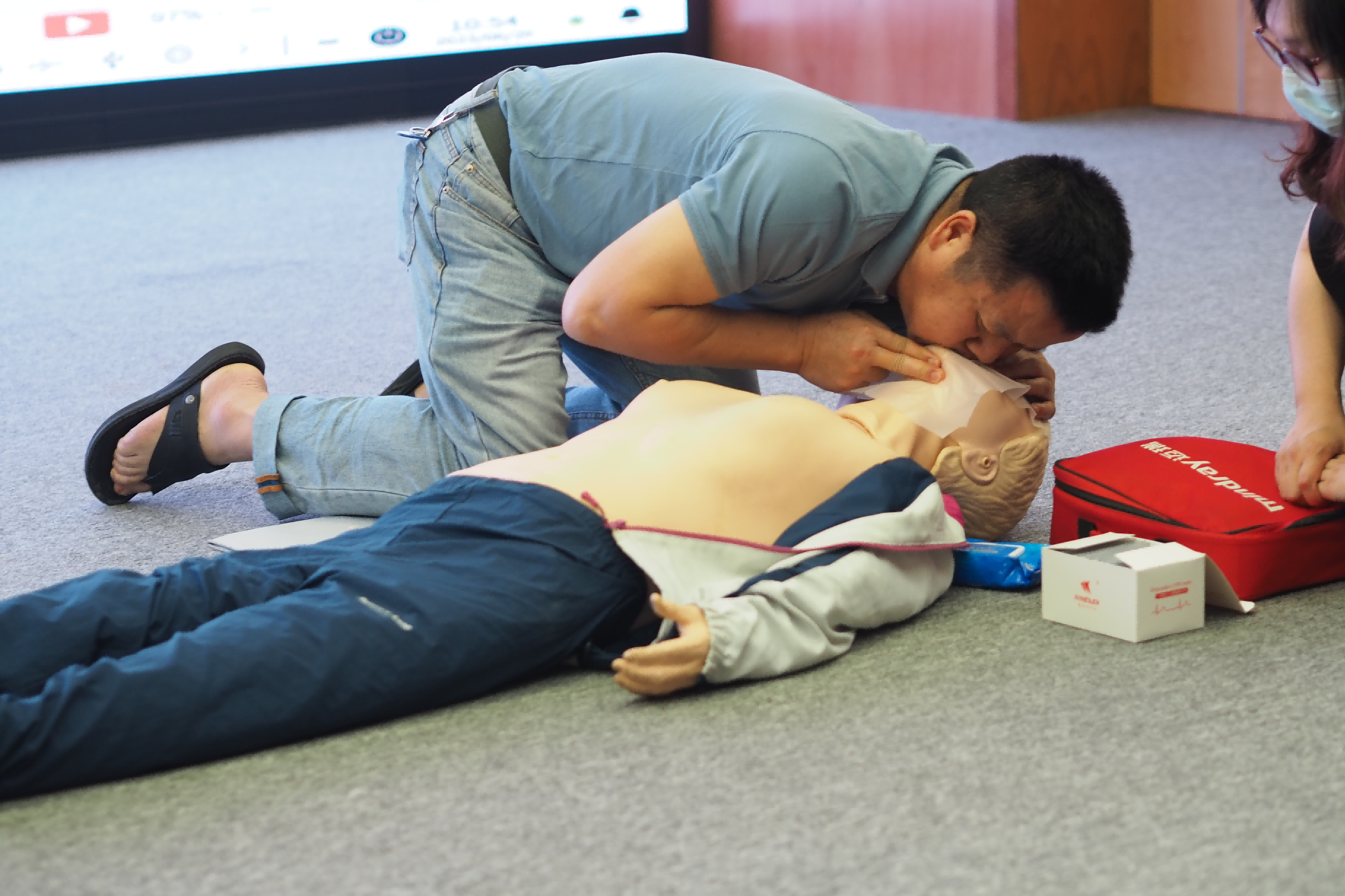 猝死指平时健康者或看似健康的人群,突然出现短时间内、因为自然疾病而突然死亡,是人类最为严重的疾病之一。然而,通过把握患者猝死后的“黄金四分钟”进行正确施救,能够有效挽回患者的生命。讲师深入浅出地向科技馆员工讲解了心肺复苏的实际原理和重要性,以视频展示和实际演示的方式示范了心肺复苏的完整步骤,从现场环境评估、向群众求助和呼救,再到实施胸外按压、人工呼吸和使用自动体外除颤器(AED)等救护过程,随后又演示了针对急性呼吸道异物阻塞的海姆立克腹部冲击法。在讲师的演示与指导下,科技馆员工进行了认真的学习与实践。
