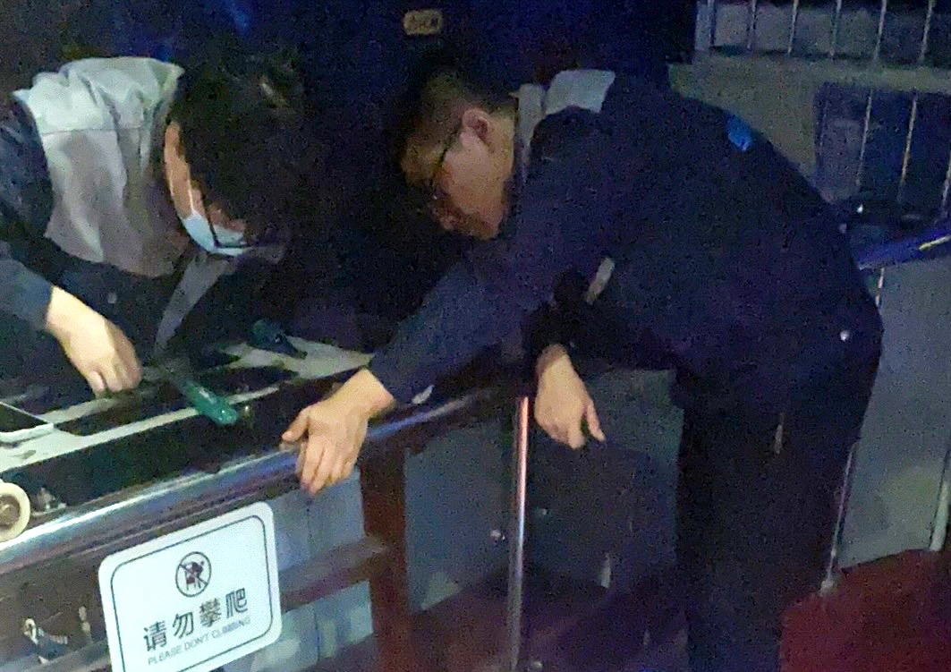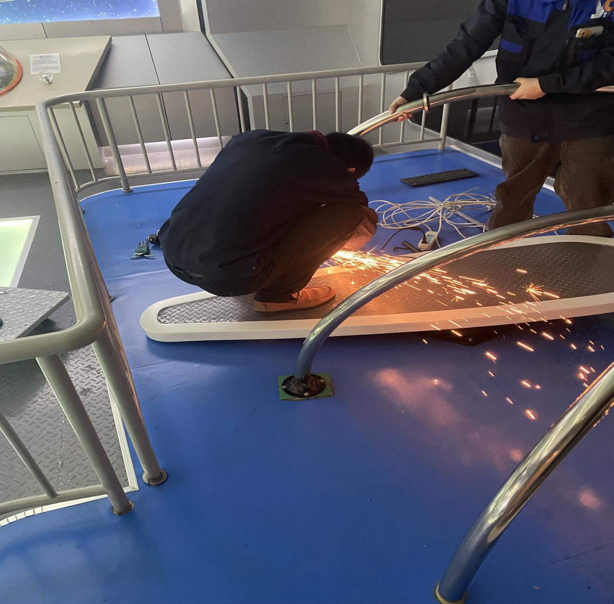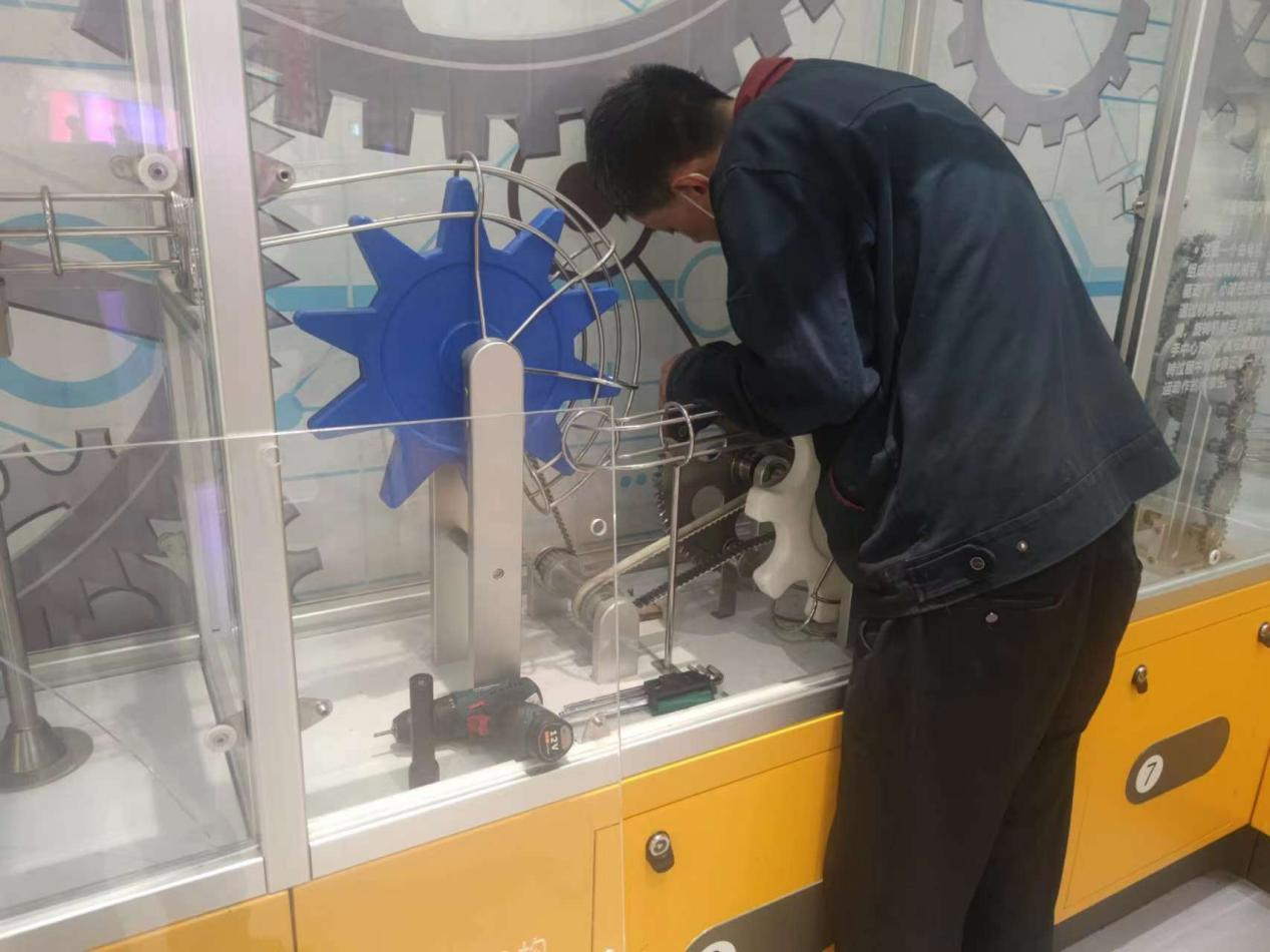 比如重力跳跃展项,观众参与热情高,加上展品自身原因,极易损坏。维修人员三天两头都在更换钢丝,绑橡胶拉力绳,始终保证两个相同展品,有一个能够运行;台风剧场下面水管断裂漏水,为了不影响参观效果,维修人员在周一周二闭馆期间,更换水管并使用抽水机将流水抽出;跳华尔兹的盒子展项,经常出现程序卡死,轴承不转的现象,在维修无法解决的情况下紧急联系厂家,磐石公司派专人来解决,让物流效果畅达。