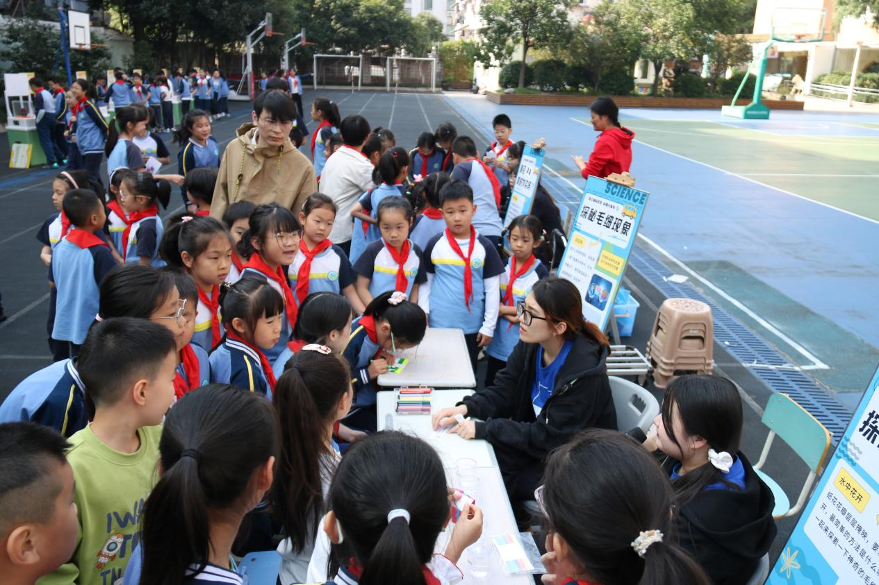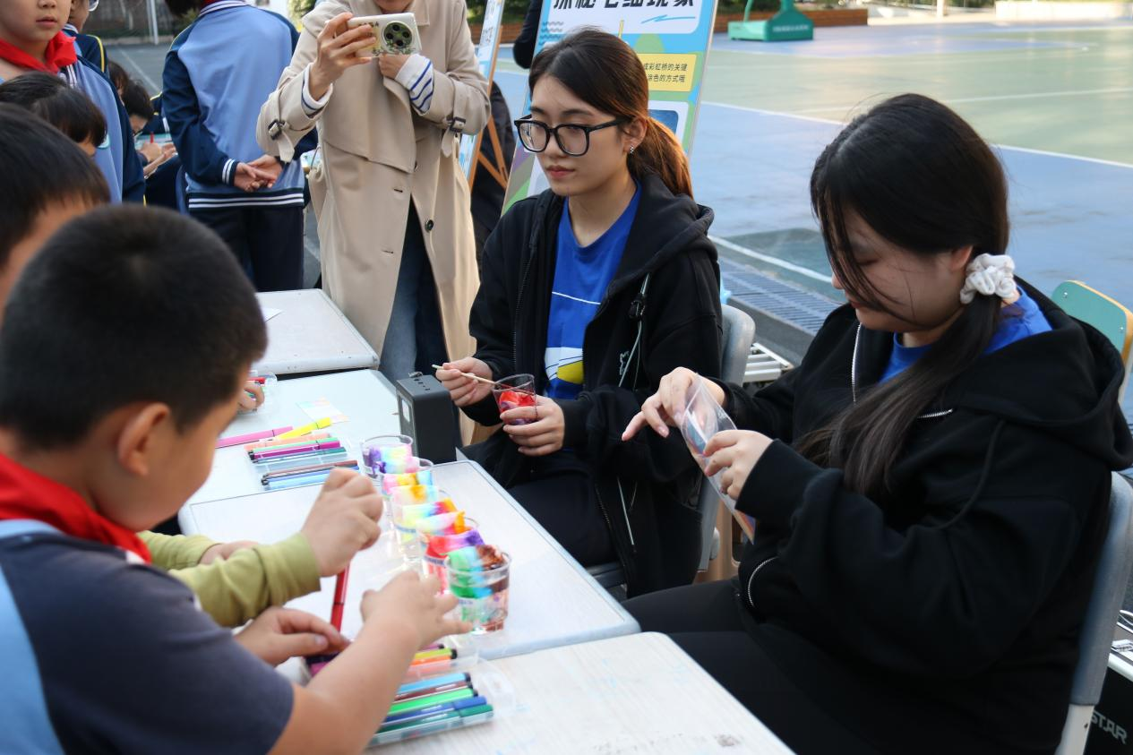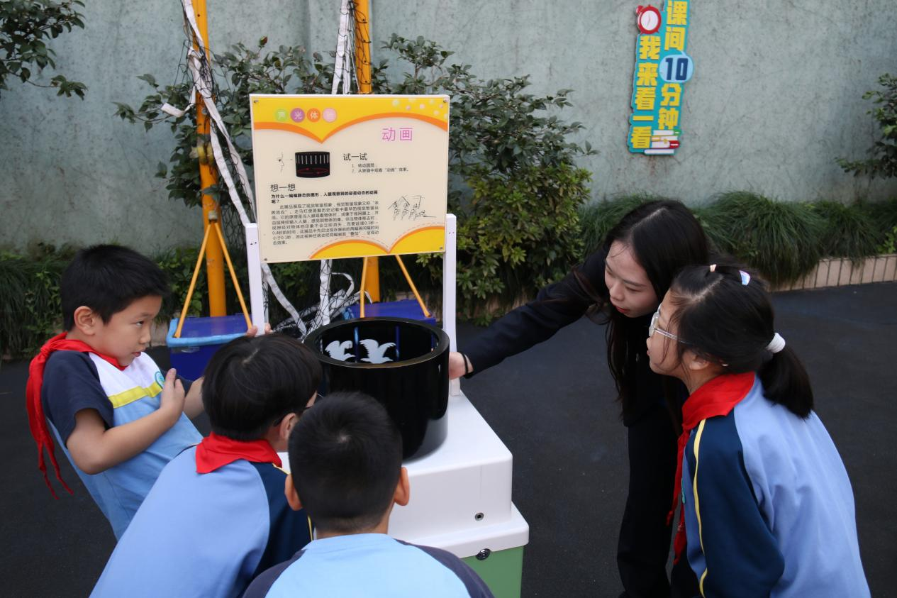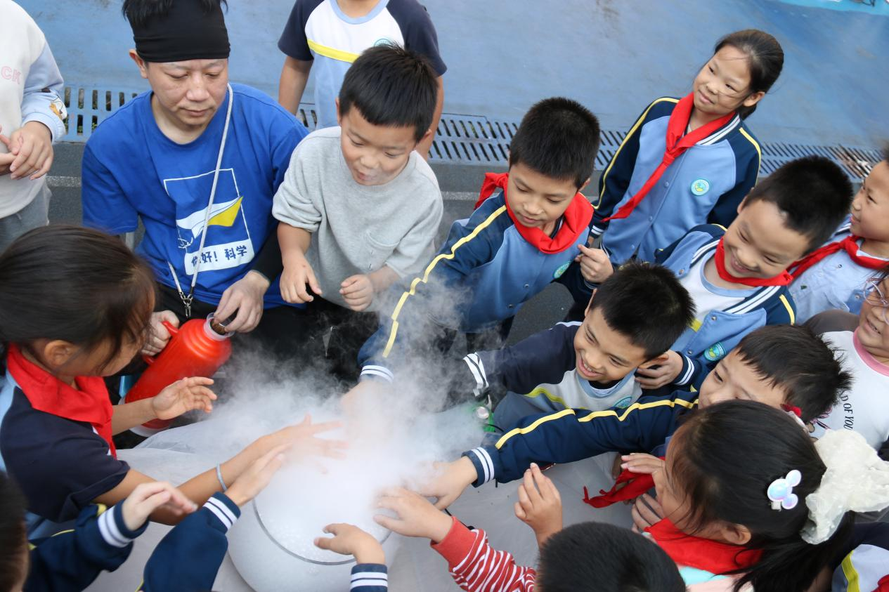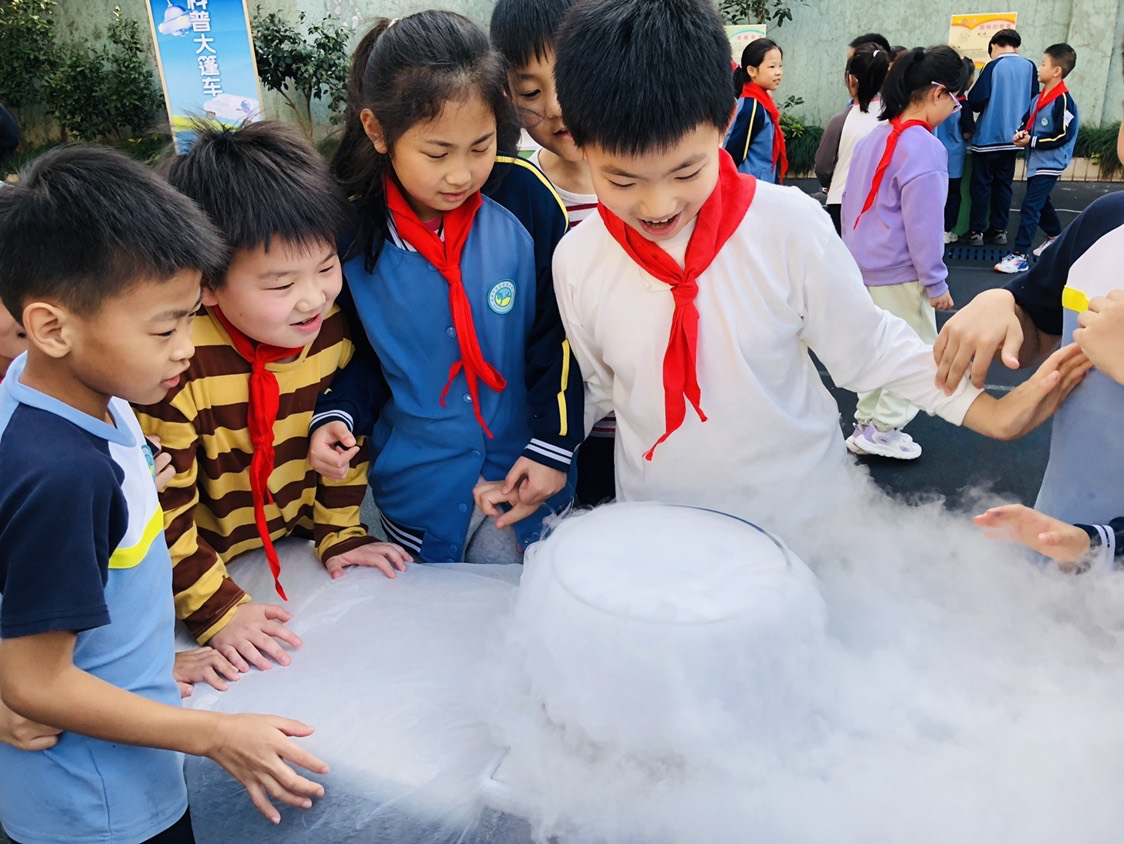 在流动展品旁,辅导员们还带来了各种有趣的科普小实验。同学们在《水中花开》和《彩虹桥》活动中学习到了毛细现象;一个个五彩缤纷的“笼中鸟”和“缸中鱼”在操场上转动着,同学们通过亲手制作体验了视觉暂留现象。另外,辅导员还将“蘑菇云”带到了操场上,同学们近距离观察干冰的升华现象,在亲手戳破泡泡的瞬间发出感叹。