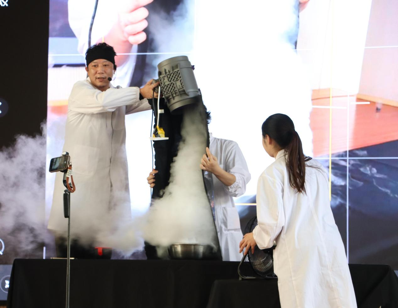 本次开幕式中,科普辅导员们为小骏马们带来了《掌控雷电吧!》科普实验秀。辅导员们通过干冰遇热水升华生成“蘑菇云”的实验,展示了科学的奇妙。当蘑菇云膨胀破裂,云雾四散的瞬间,现场掌声四起,孩子们的脸上写满了惊叹与好奇。接着,人造龙卷风表演进一步点燃了孩子们的热情,而“灯管半亮半暗”的互动实验,让同学们亲身体验到人体可以导电。压轴的“闪电龙卷风”实验更是将活动气氛推向高潮,孩子们纷纷惊叹于科学的魅力。
