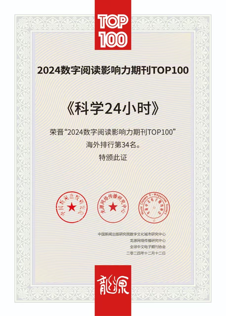 12月12日,中国新闻出版研究院与龙源数字传媒集团联合发布了《2024数字阅读影响力期刊与知识阅读城市TOP100》。《科学24小时》在龙源期刊网收录的4000多家期刊中脱颖而出,荣晋“2024数字阅读影响力期刊TOP100”(海外)榜第34名,距离23年排名上升36个名次。