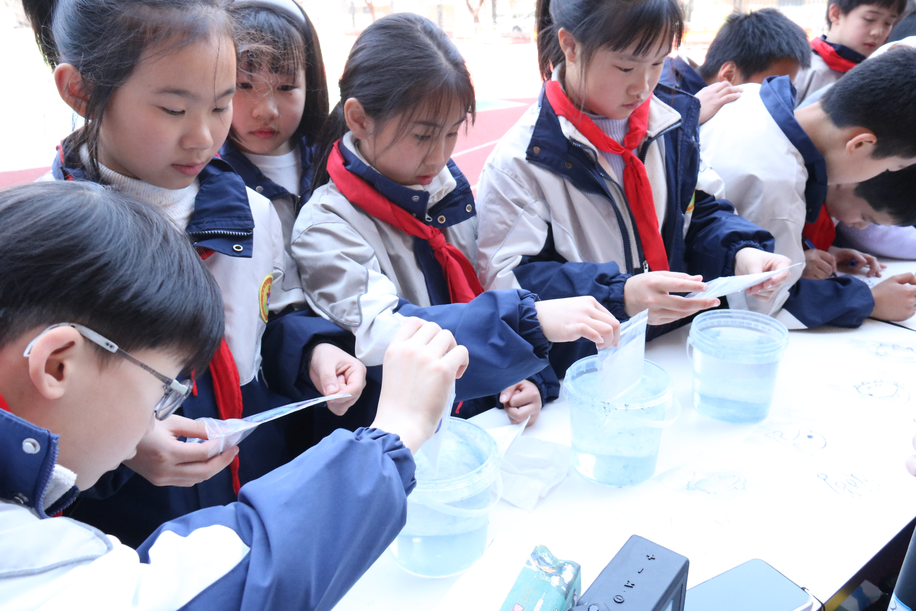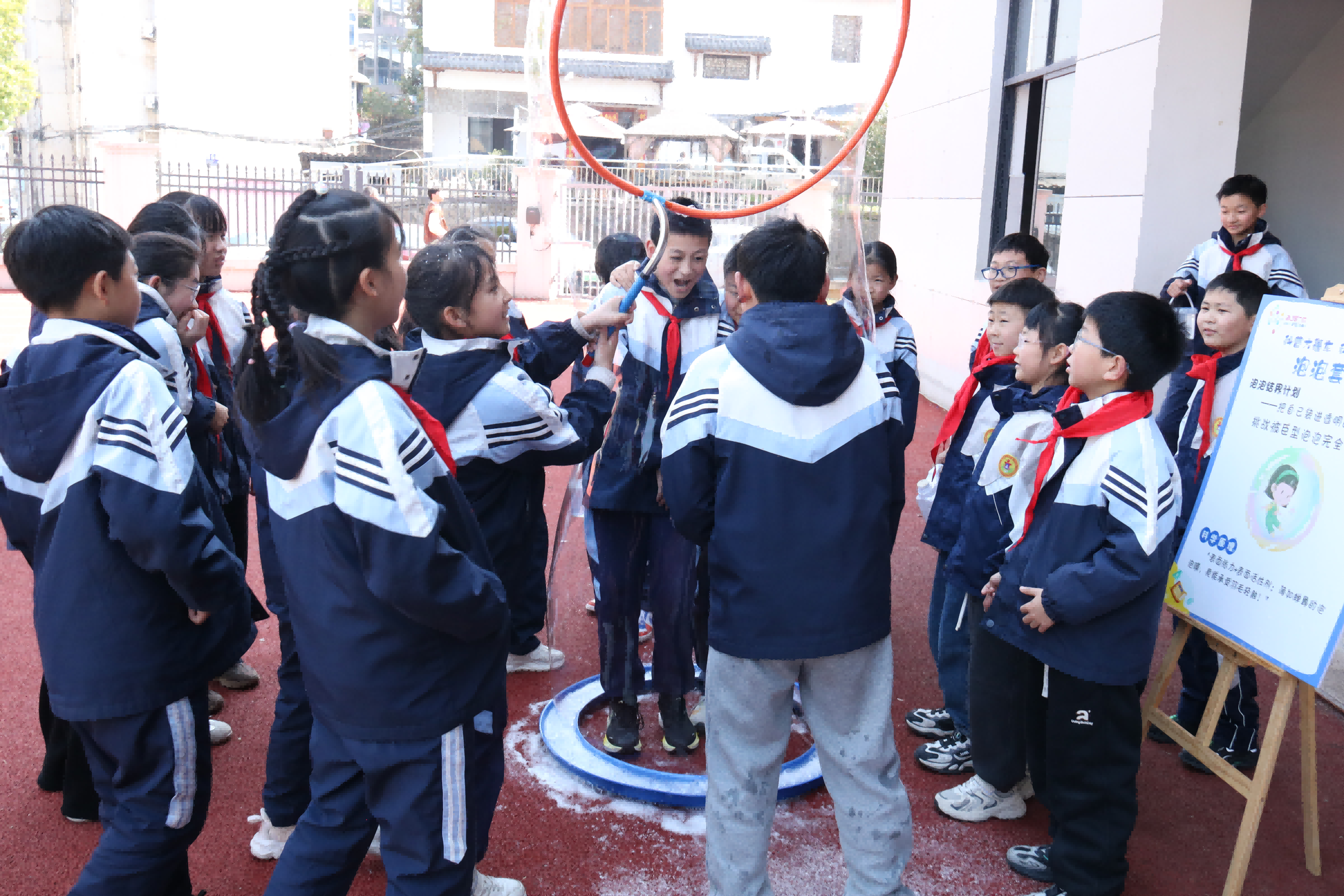 现场,每位同学摇身变成小小科学家,动手开展一系列有趣的科学实验。他们体验了人造雪花、色彩隐身术等科普活动。尤其是在“泡泡结界计划”中,同学们挑战被巨型泡泡完全包裹,感受表面张力和表面活性剂的神奇作用。这些活动不仅锻炼了学生的动手能力,更激发了他们探索科学的兴趣。