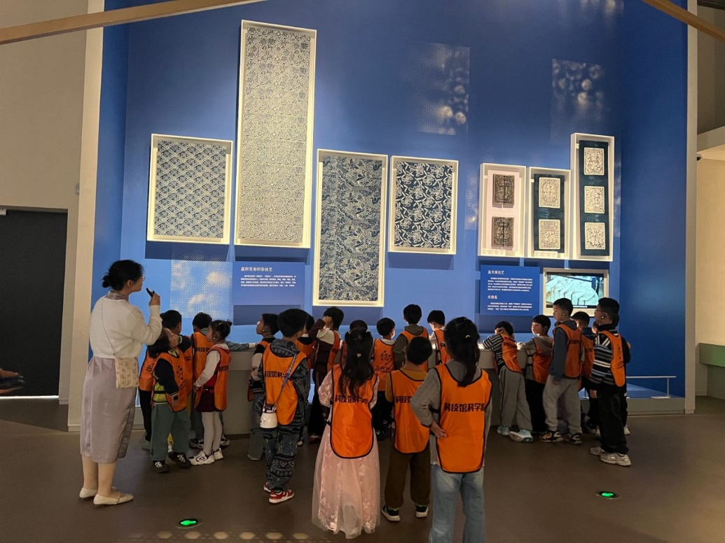 活动开始,孩子们在讲解员老师的带领下,进行了一次沉浸式的文化探索之旅。在非遗馆内,孩子们通过实物、影像和互动展陈,直观地感受到了传统技艺的精妙与匠心。其中,蓝印花布印染技艺所展现的丰富多彩的图案与朴实大方的风格,更是让孩子们产生了强烈的好奇心——这么漂亮的图案是怎么染上去的呢?在这里,孩子们仿佛穿越时空,亲身感受到了传统文化中蕴藏的无穷智慧,每一处都让孩子们流连忘返,对非遗文化有了更加直观和深刻的认识。