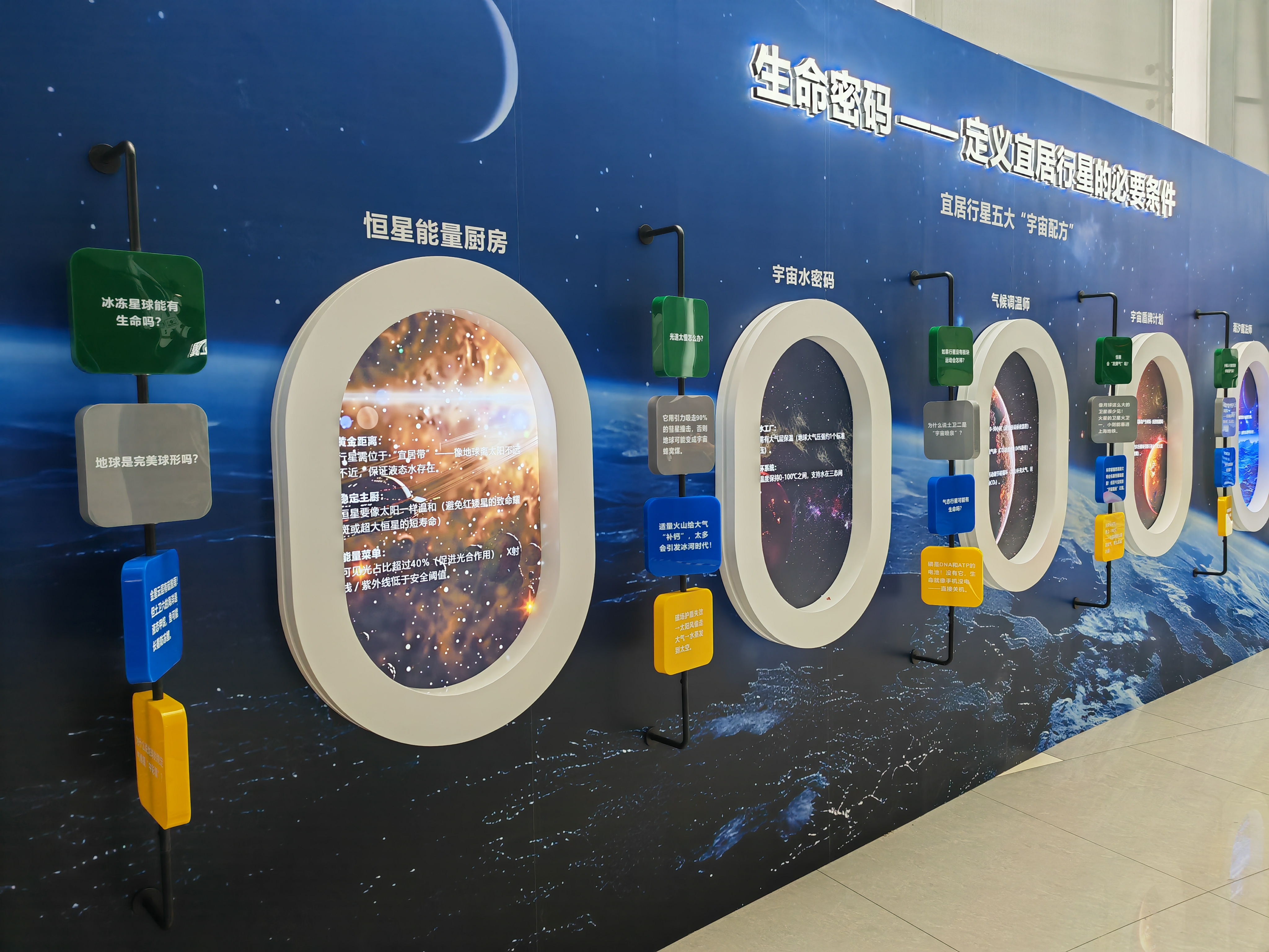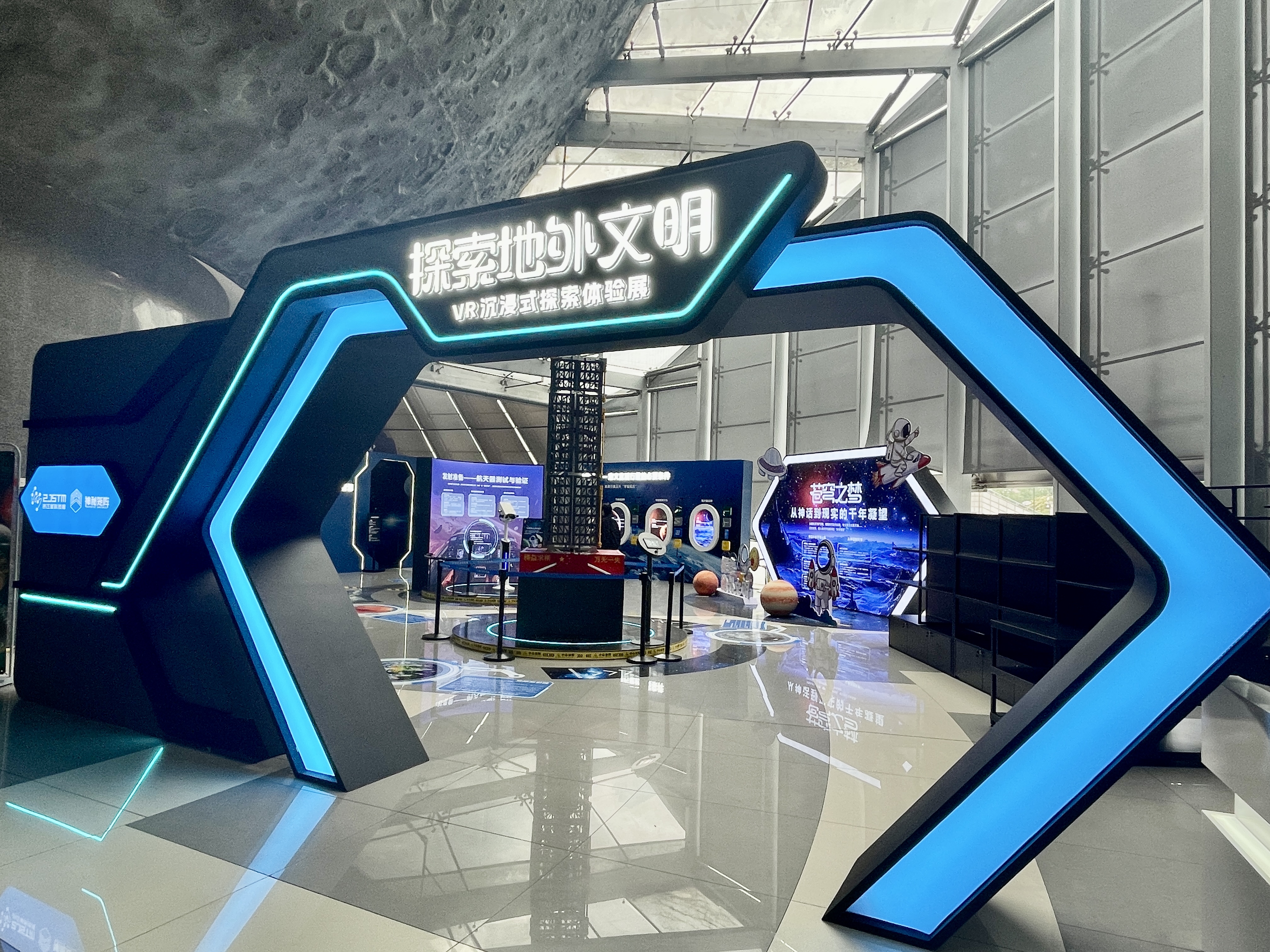 《探索地外文明》主题VR沉浸式体验展是浙江省科技馆推出的结合天文、物理、航天工程多领域知识体系的特色展览。该展览以虚实交互激发青少年科学探索热情,培养跨学科思辨能力,实现科学素养的立体化提升。包含五大版块,分别为“苍穹之梦”“人类探索宇宙的工具”“寻找宜居星球”“出发探索地外文明”“返航家园”。