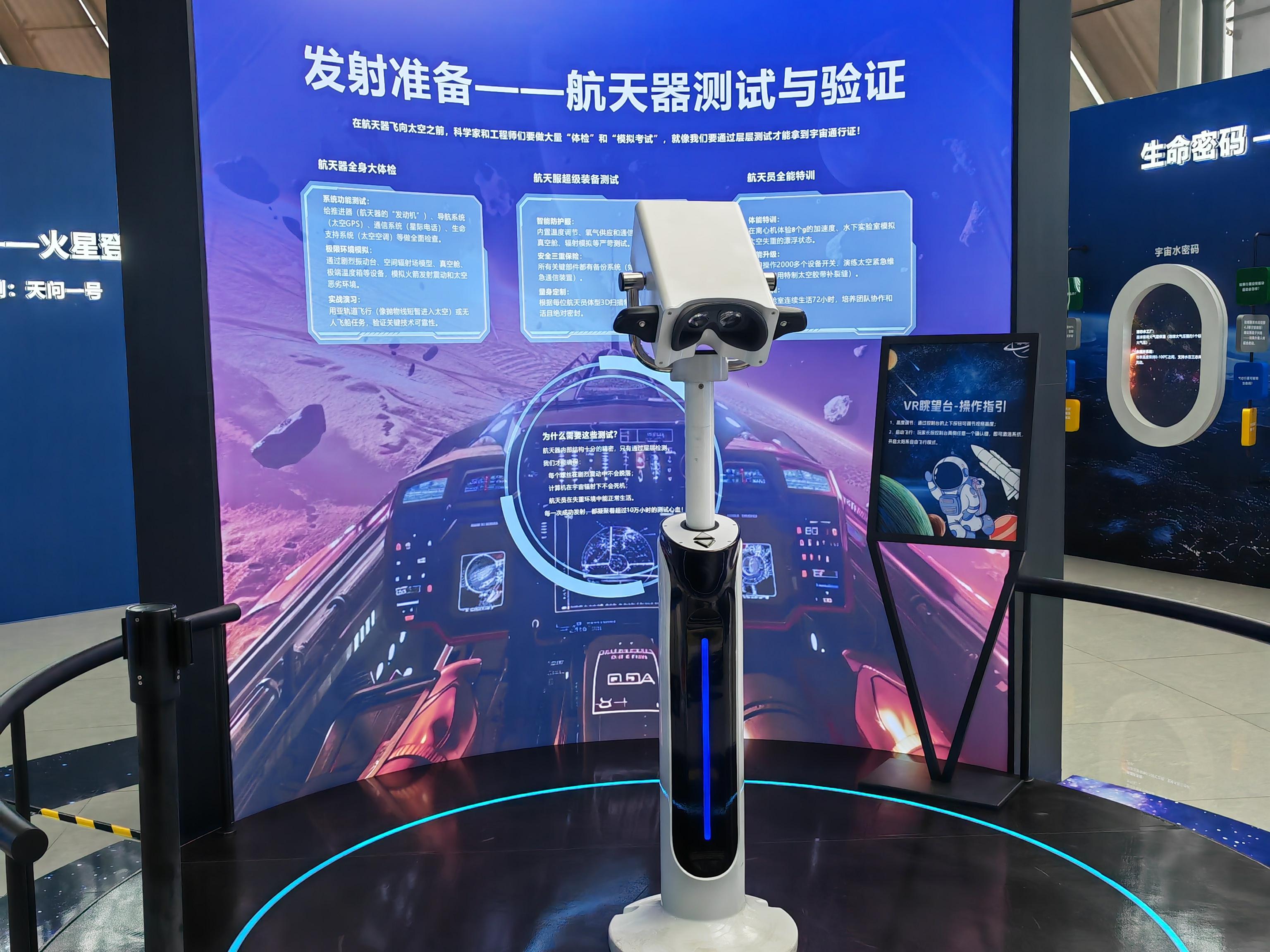 观众通过佩戴专业头显设备,沉浸式体验探秘地外文明之旅。从中一边汲取天文知识,一边感受外星球模拟氛围的壮阔与震撼。