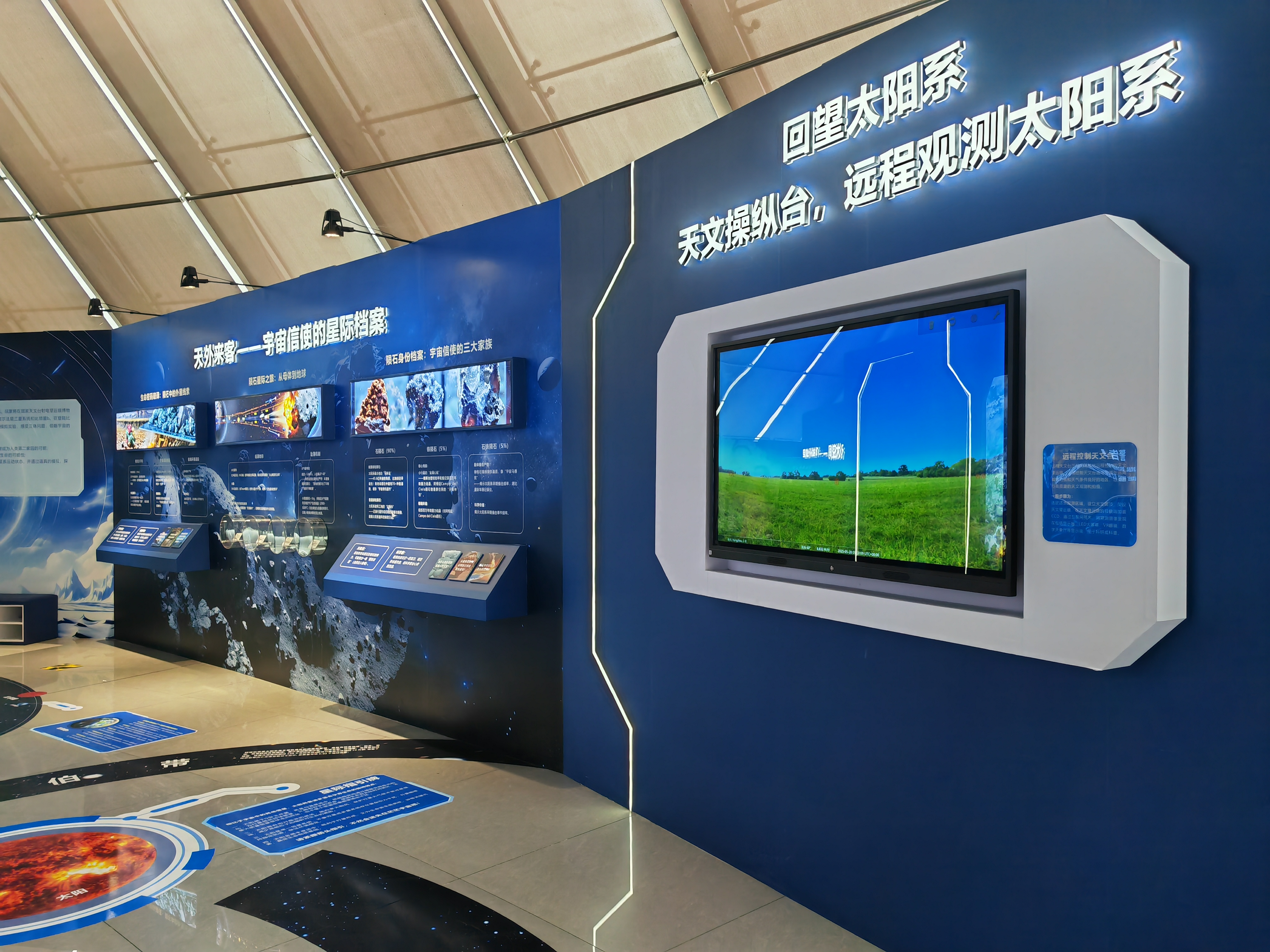 “回望太阳系”展项观众通过互动显示设备可实时远程观测太阳系。该展项实时接入了新疆阿勒泰沙尔布拉克天文台的观测数据。