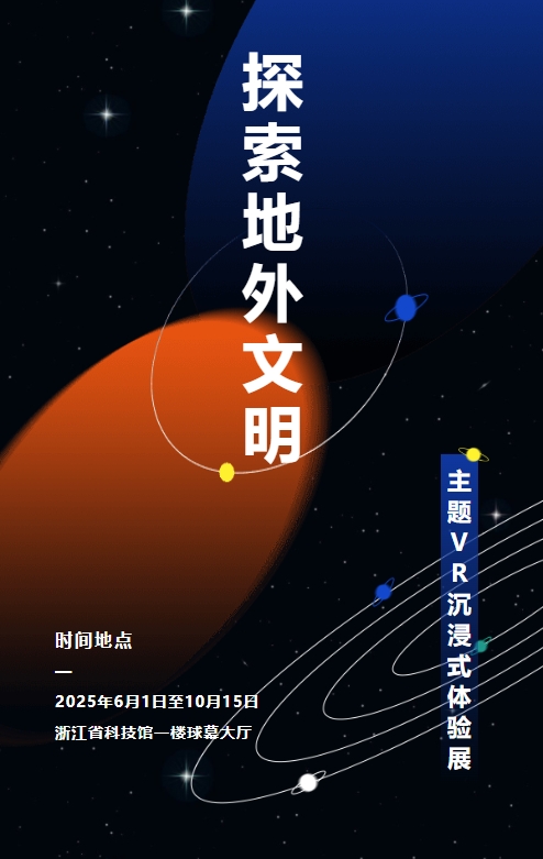 欢迎广大游客来浙江省科技馆参观“探索地外文明”VR沉浸式探索体验展,踏上一场激动人心的地外文明探索之旅……