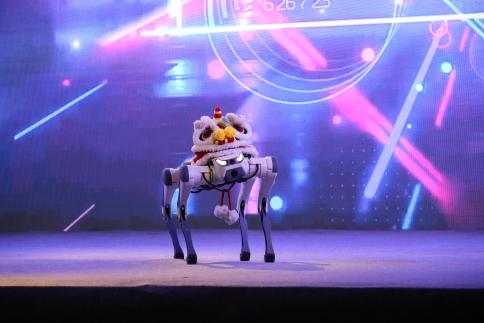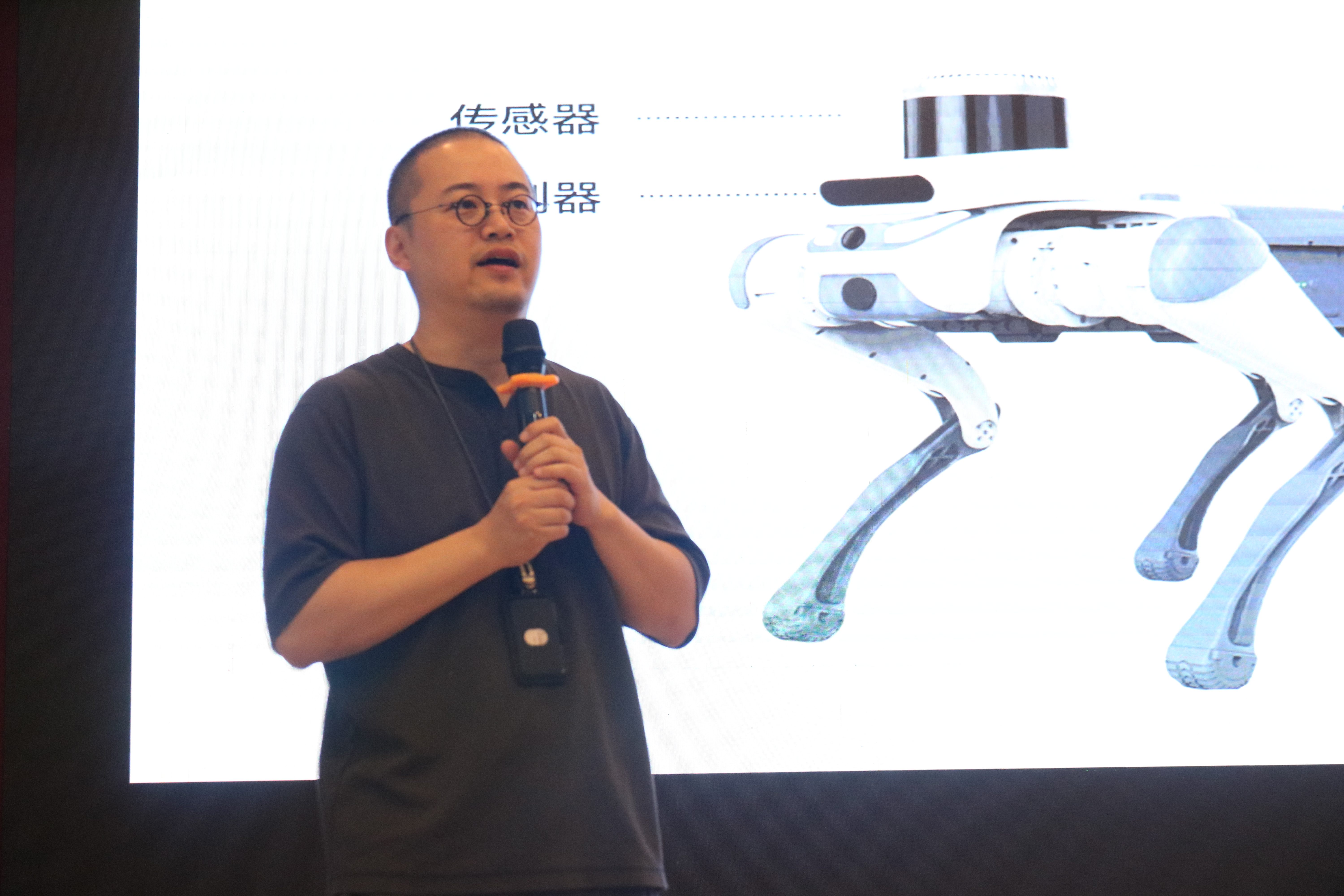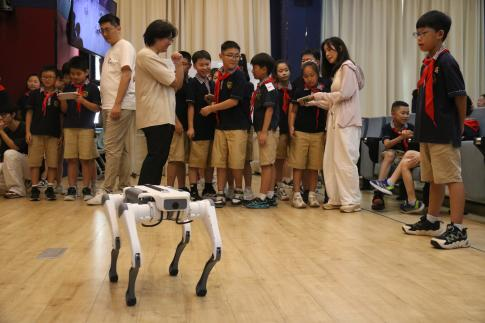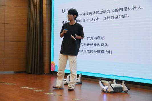 随后,杭州云深处公司的团队为学生们讲解了人工智能的发展历史,同时配合机器狗展示了语音交互功能和“打招呼”、“站立”等动作,引发阵阵掌声。不少同学还亲自上手操控机器狗,近距离感受传感技术与运动算法的精妙配合,体验人机交互的无限可能。