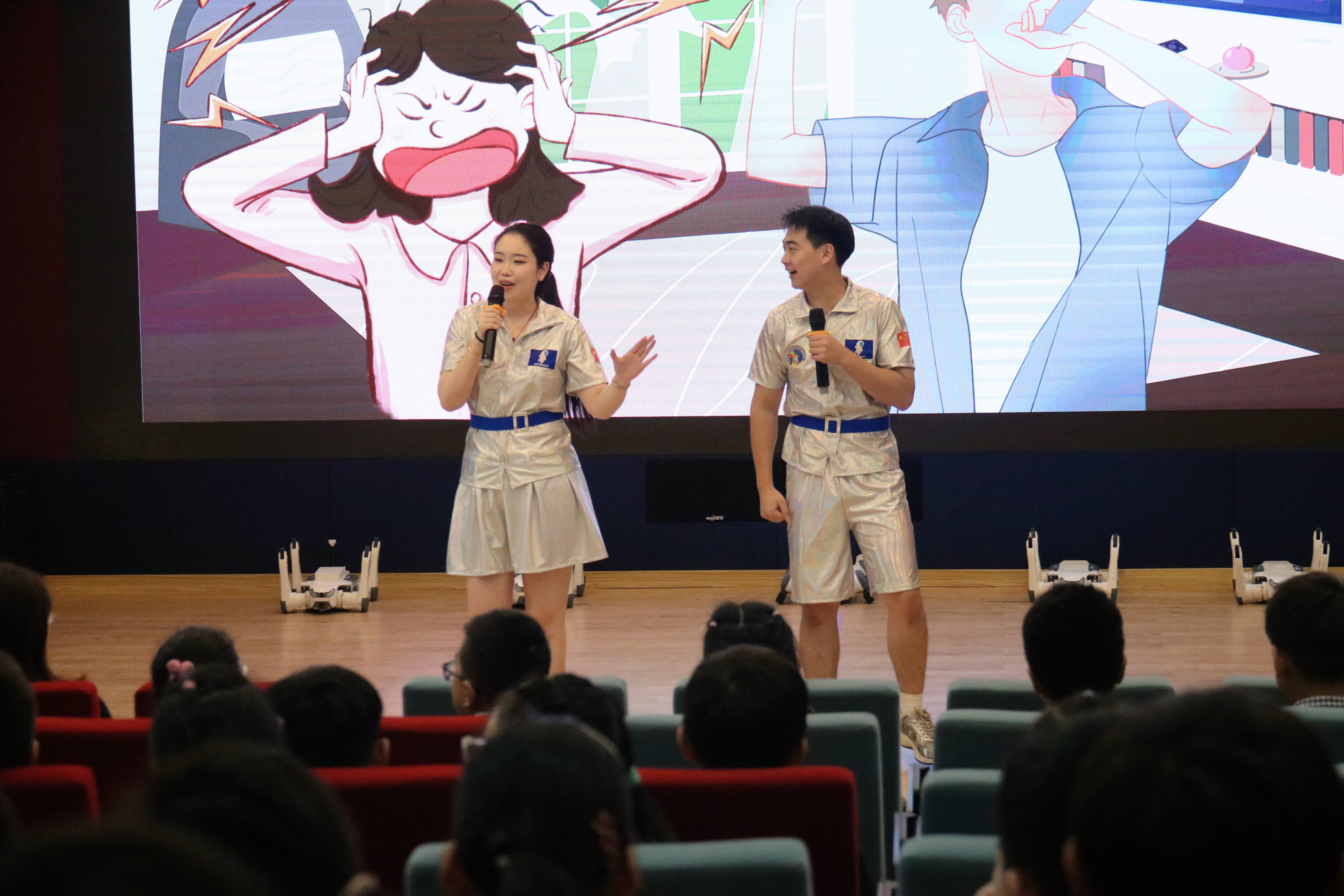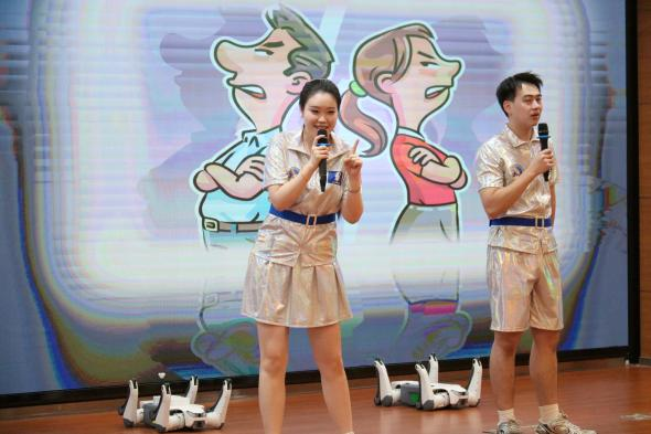 在舟山绿城育华学校,人工智能科普活动同样丰富精彩。活动以《趣谈AI》脱口秀作为开场秀,通过幽默风趣的对话和生动的情景演绎,展示人工智能在大数据分析、智能推荐等领域的应用,让学生在欢笑中感受科技如何温暖生活、改变未来。
