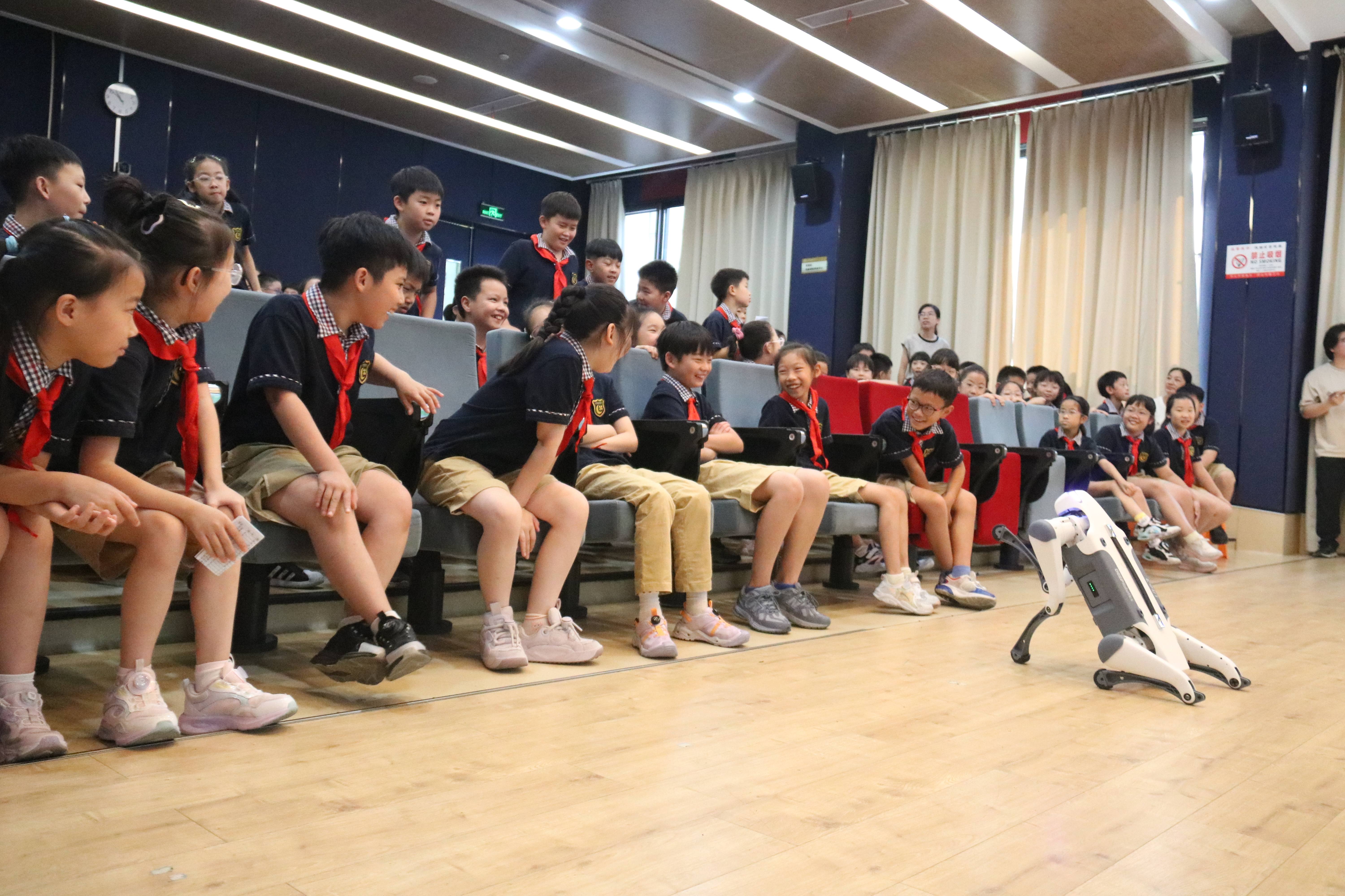 最后一站大篷车驶入了嵊泗县洋山镇学校,一场沉浸式的人工智能科普嘉年华在这里精彩上演!文化礼堂中,全校180名师生齐聚一堂。《趣谈AI》拉开序幕,让孩子们在轻松有趣的氛围中了解人工智能的应用价值。随后,云深处老师进行机器狗科普讲解与演示,全校学生们在老师指导下依次体验机器狗的操控。现场充满欢笑与惊叹声,每一名学生都能亲身参与,直观感受人工智能技术的趣味与魅力。