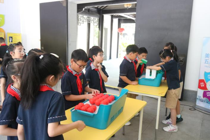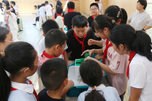 报告厅外,人形机器人和大篷车互动展品也被学生们团团围住。大家兴奋地与机器人进行握手击掌互动;桌面展品“珠子塔”则通过趣味操作,引导学生在动手中培养逻辑思维与解决问题的能力。