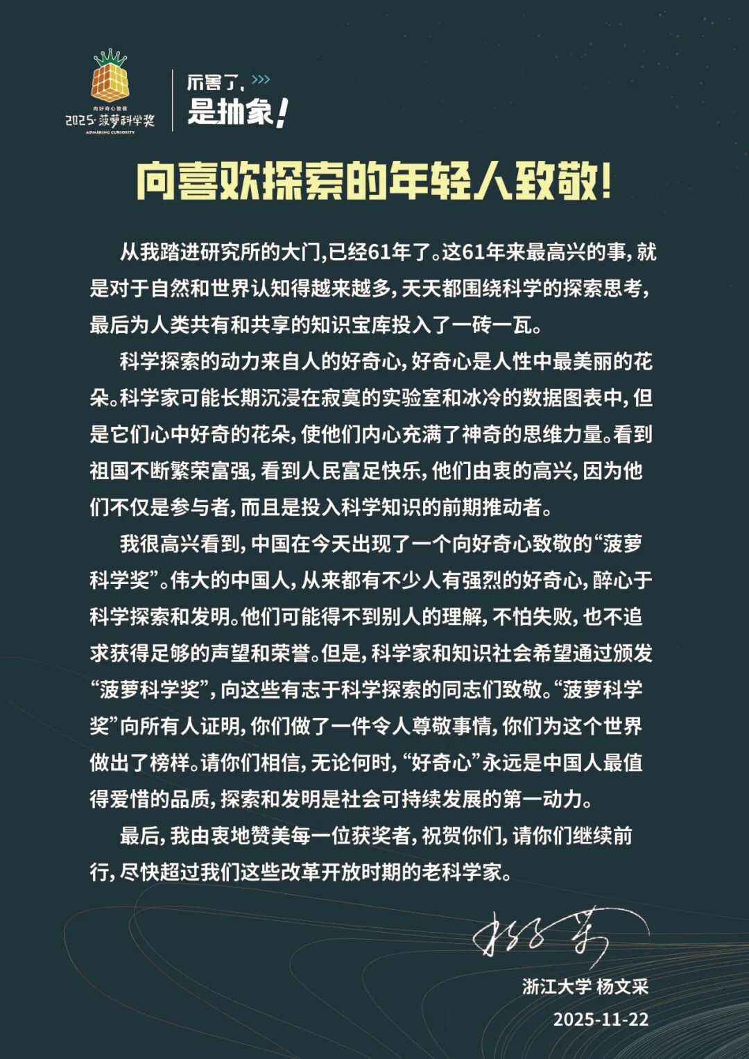 在颁奖典礼的最后,白发苍苍的杨文采院士为大家读了他写的信: