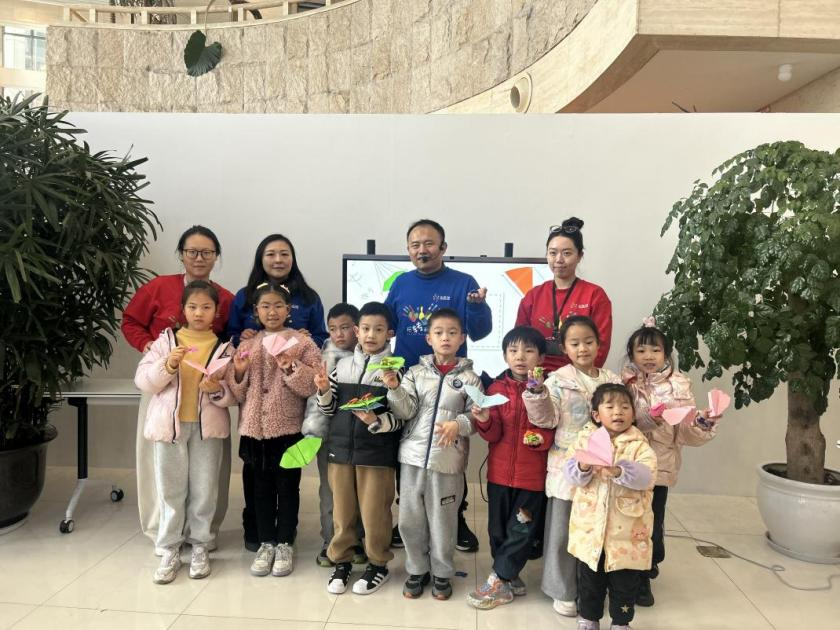 活动一开始,老师化身为“折纸魔法师”,生动演示纸青蛙弹跳、纸飞机滑翔背后的科学。小朋友们听得入神,踊跃举手发问,现场洋溢着热烈与好奇。