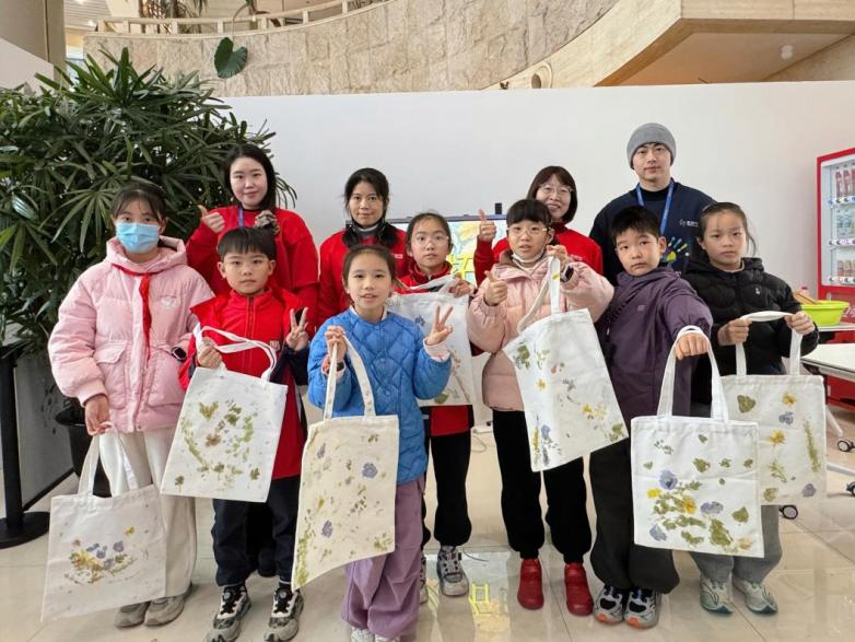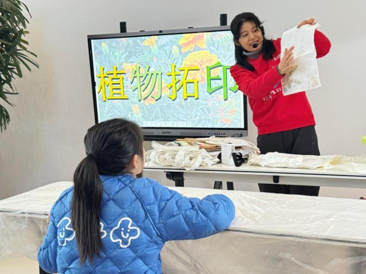 老师先为大家讲解了植物拓印的意义与方法,并建议选取叶脉清晰、色泽鲜明的花草,这样更容易拓印出鲜艳持久的图案。小朋友们认真挑选心仪的植物,细心吸去水分,在帆布包上精心构图、固定。随着一阵阵轻快的敲击声,花草的汁液缓缓渗出,轻轻揭起叶片,自然的纹理与色彩便永久留在了布袋之上。
