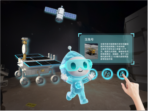 还记得一楼的“玉兔号”月球车模型吗?戴上AR眼镜,你将亲眼见证: