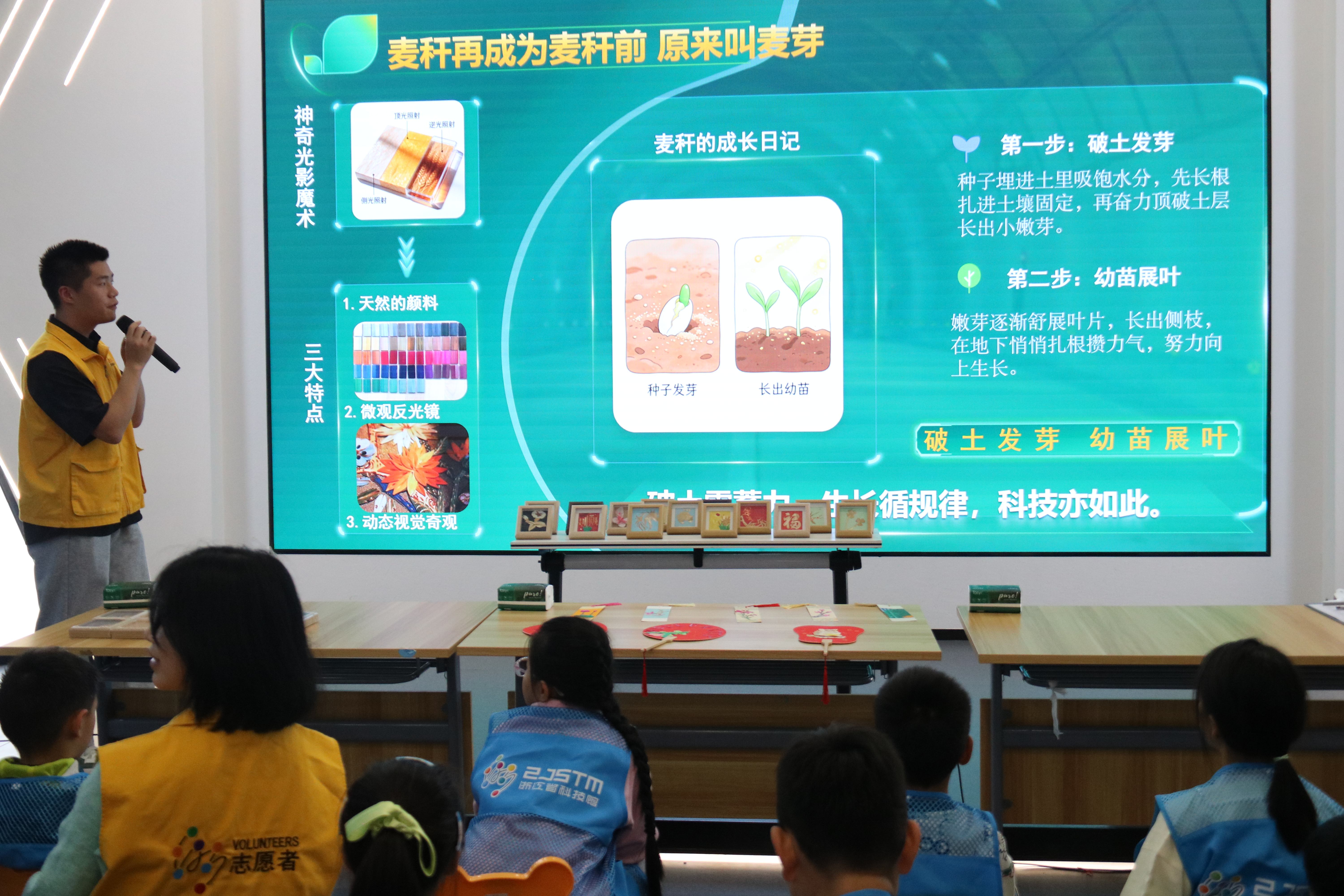 在认识麦秆画环节,志愿者们用通俗易懂的语言,为孩子们讲解了麦秆画的悠久历史,揭秘了这项手艺的神奇:无需颜料、不用电烙铁,仅凭麦秆本身的嫩黄、金黄、浅褐等天然色彩和表面的纤维纹路,就能借助光线反射呈现出灵动的光泽。同时,志愿者们还补充了小麦的生长奥秘,从种子发芽到麦穗成熟,一步步讲解麦秆的成长历程,让孩子们了解到这根不起眼的麦秆里植物生长的科学知识。