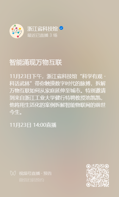 本期“科学有观”特别邀请到来自浙江工业大学健行特聘教授池凯凯,他是浙江省杰出青年基金获得者,浙江省“万人计划”青年拔尖人才。池老师将用生活化的案例拆解智能物联网的前世今生,聊聊这项技术如何智能蜕变,又怎么重塑我们的多彩世界。