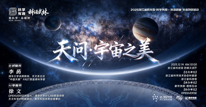 你是否曾仰望星空,好奇那无垠的宇宙深处藏着什么?12月14日(周日)上午,浙江省科技馆“科学有观·科话武林”年终特别活动,特邀清华大学讲席教授、天文系主任 、“中国天眼”FAST原首席科学家李菂教授与OPENVERSE创始人、清华大学X-Lab客座讲师徐文——共同为你打开一扇通往宇宙之美的大门。