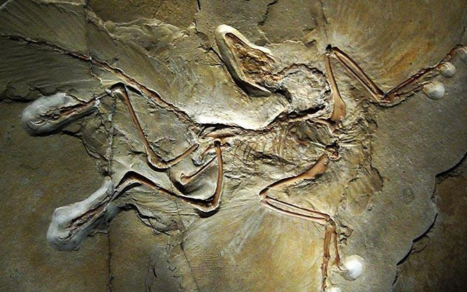 始祖鸟骨骼化石的翅膀和尾巴上带有发育良好的羽毛印痕