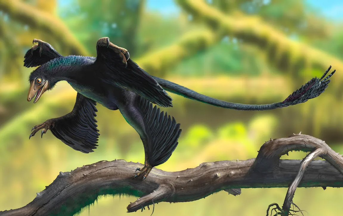 在1.25亿年前的我国热河生物群,一只乌鸦大小的小盗龙正在树冠间游荡。当它舒展身体时,从四肢延伸出的4片漆黑羽翼在阳光下泛起彩虹般的光泽。突然,树木的倒塌声惊动了这个远古滑翔者,只见它张开前后肢的羽翼,像一只灵巧的纸鸢,轻盈地掠过古老的丛林。