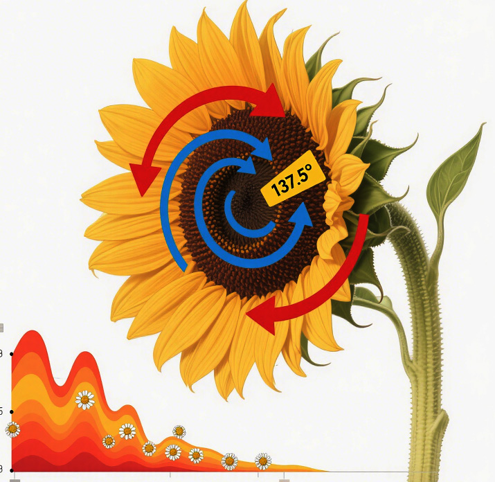 以向日葵为例,头状花序上小花的斐波那契数列排列方式
