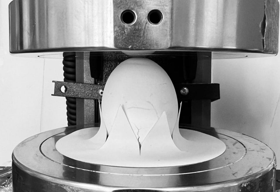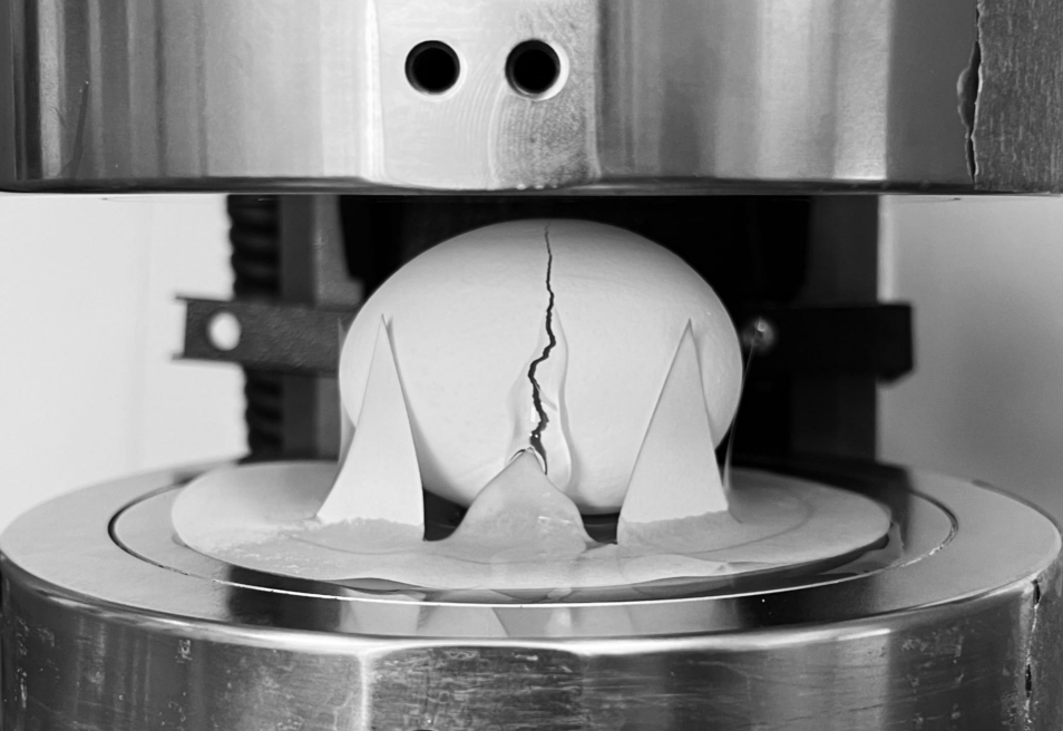 那么,这是什么原因呢?到底哪个方向更能扛住外力?为了寻求答案,物理学家用压缩机对鸡蛋进行“压碎测试”,检测在水平和垂直方向压碎鸡蛋所需的力。结果显示,无论是竖着压还是横着压,鸡蛋都需要大约45牛的力才能被压碎。不过,在横向受力时,鸡蛋能够在破裂前承受更大的变形。也就是说,它可以吸收更多的冲击能量,更具“韧性”。