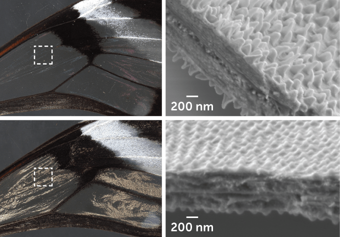 玻璃翅蝶翅膀的透明部分只反射约2%的光线(上 ),而去除蜡层后反射的光线是正常情况下的2.5倍(下)