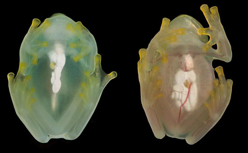 玻璃蛙休眠时身体变得透明 ( 左 ),醒来后透明度降低 ( 右 )
