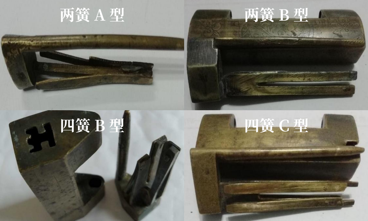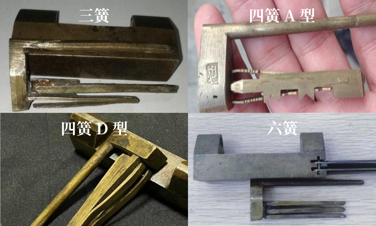 锁芯的形状取决于锁芯簧片的组合,常见的锁芯簧片一般有两簧、三簧、四簧、六簧等。常见的簧片分布有三种类型:一是分布在锁芯杆两侧的有两簧、四簧和六簧;二是分布在锁芯杆两侧和上侧或下侧的一般为三簧;三是在锁芯杆四周都有分布的为四簧。相同簧片不同型号的锁芯的主要区别在于锁芯杆的数量,如两簧A型和两簧B型等型号。