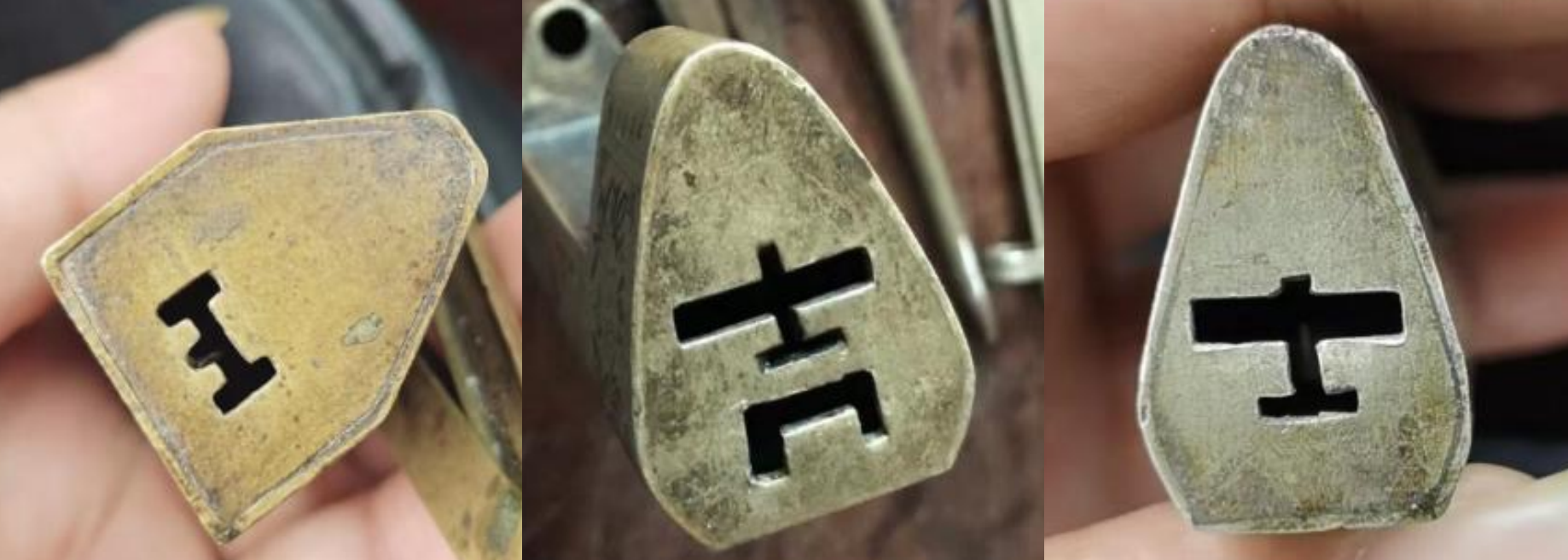 钥匙孔的形状也是五花八门,并且还是主人等级地位的象征。据说在当时,普通百姓只能使用“一字形”“L形”等简单形状的钥匙孔,而“上字形”“山字形”“古字形”“士字形”这种形状较为复杂的钥匙孔多为达官显贵所使用,“王字形”“尚字形”“吉字形”“而字形”“正字形”等形状的钥匙孔多为王公将相所使用,体现了不同人群财产价值的不同。当然,钥匙孔的形状远不止这几种。
