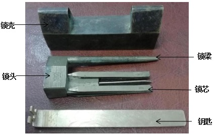 古铜锁的结构一般由五部分组成,分别是锁壳、锁梁、锁头、锁芯和钥匙。