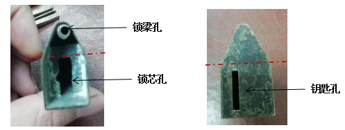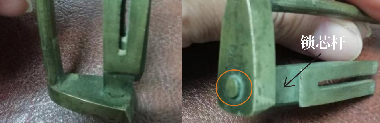 锁芯杆通过榫卯结构固定在锁头上,最终使得锁头、锁梁和锁芯成为一个整体,我们可以把这个整体称为“锁体”。