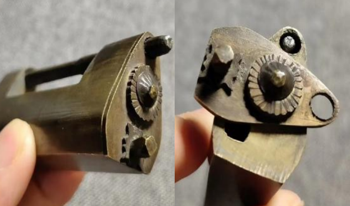 此外,有的古铜锁你甚至找不到钥匙孔,如机关锁和倒拉锁。机关锁的钥匙孔是被覆盖的状态,只有用一定的方法触动两端的按钮,才能打开机关露出钥匙孔。